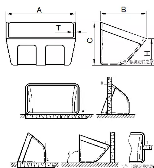 畚斗型號選擇:根據物料特性及提升產量選擇合適的型號 產量計算=3.6×(I÷A)×V×ψ×ρ I-料斗容積(L);A-料斗間距(m);V-提升速度(m/s) ψ-填充系數;ρ-物料松散密度(t/m3) 根據物料特性選擇畚斗材質。 畚斗的測量:針對已有實物的畚斗進行測量,正確測量方法如下圖