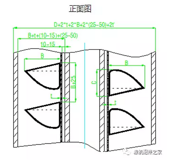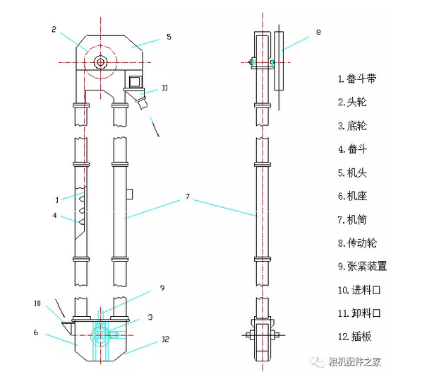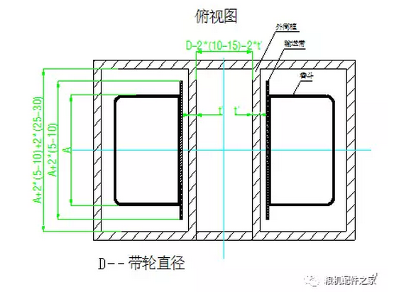 ◆斗式提升機的主要構件選型 畚斗帶:斗提機頭,尾輪之間的牽引件。 長度選擇:根據提升機提升高度選擇合適的長度,一般將尾輪固定部件調松后提升至高位置(使的兩輪間距小),測量出長度。 畚斗帶長度=2*(頭、尾輪中心距)+頭輪直徑 寬度選擇:根據提升機單個機桶長寬尺寸選擇合適的寬度, 畚斗帶寬度:=單個機桶寬度-2*(25-30mm) 畚斗帶型號選擇:根據提升高度,頭、尾輪直徑,物料特性及提升產量選擇合適的畚斗帶型號。一般需要經過詳細的計算。 畚斗:斗提機裝載物料的零件。 畚斗長寬選擇:根據機桶尺寸及畚斗帶尺寸選擇合適的尺寸。如下圖